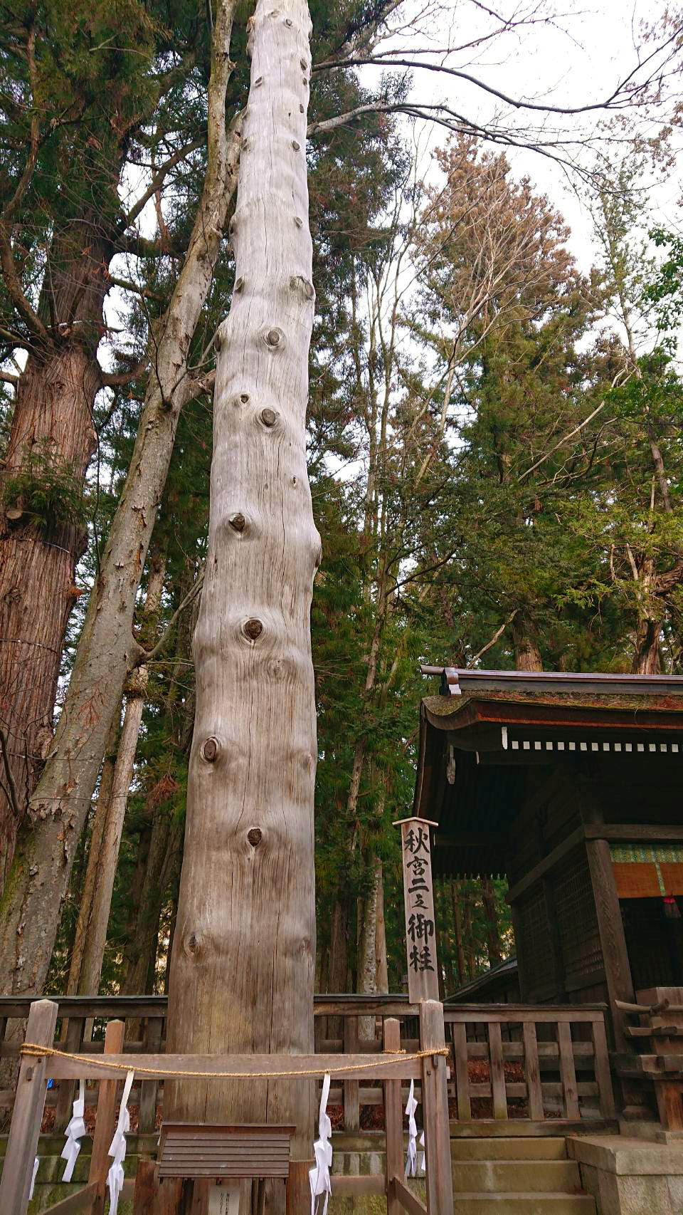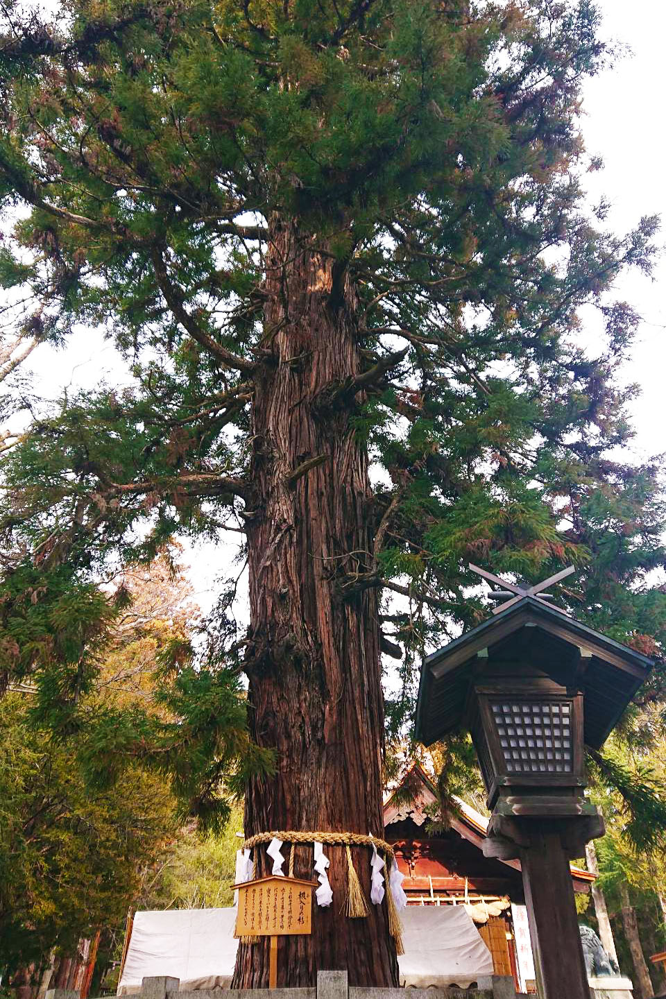 これは、先が二又に分かれている巨大な杉の木です。根元は1つであることから「結びの杉」と呼ばれ、縁結びにご利益があると言われています⭐